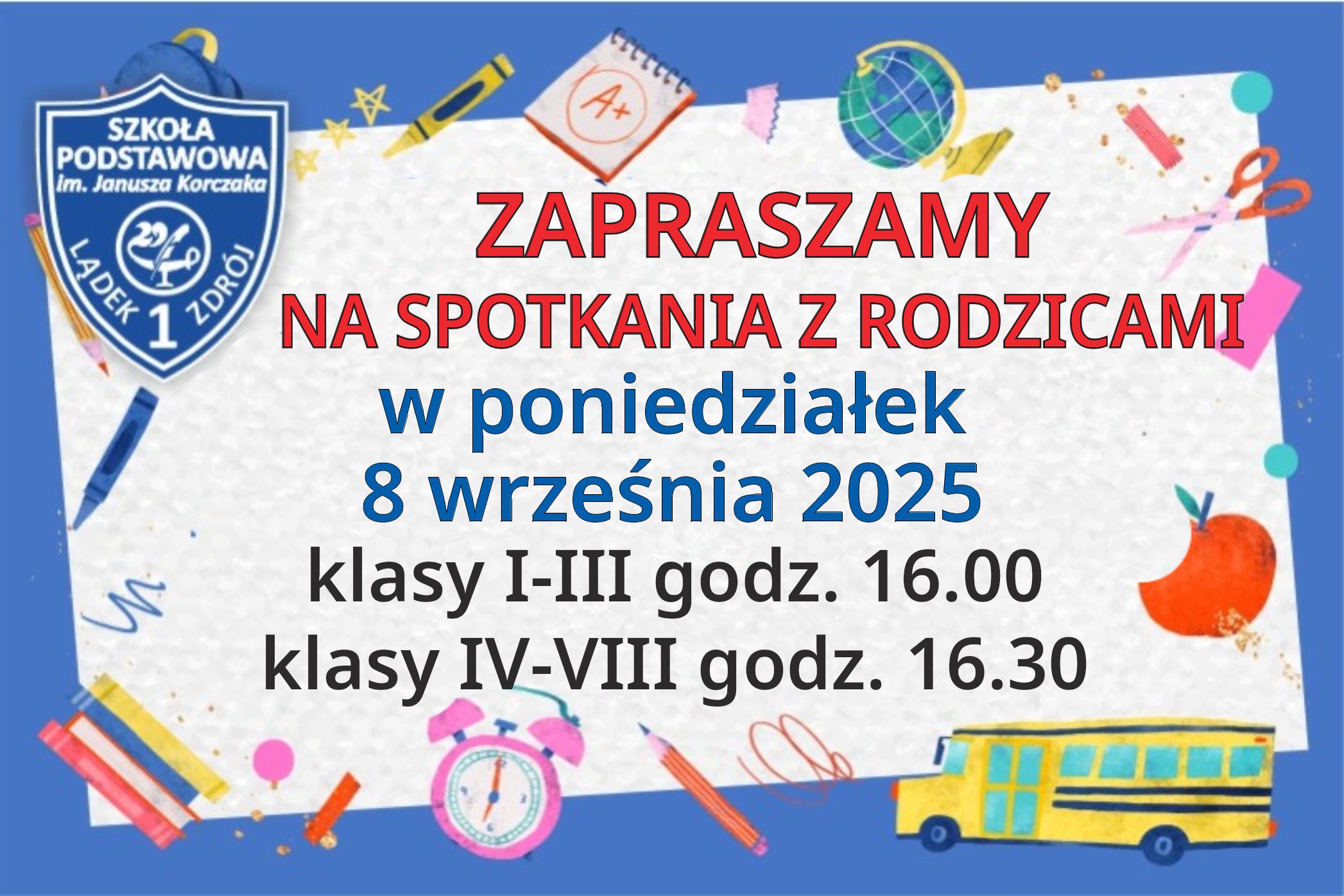 Zapraszamy na spotkania wychowawców z rodzicami w najbliższy poniedziałek 8 września 2025 r. klasy I-III godz. 16.00 klasy IV-VIII godz. 16.30