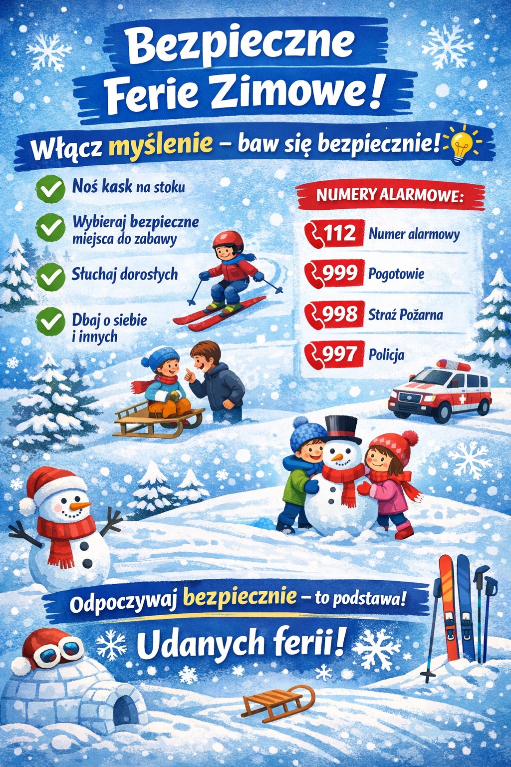 Ferie zimowe już tu są i to jest świetna wiadomość! Dobra zabawa najlepiej smakuje wtedy, gdy jest bezpieczna. Drodzy Uczniowie, podczas zimowego wypoczynku włączcie myślenie na stoku, na lodzie, na